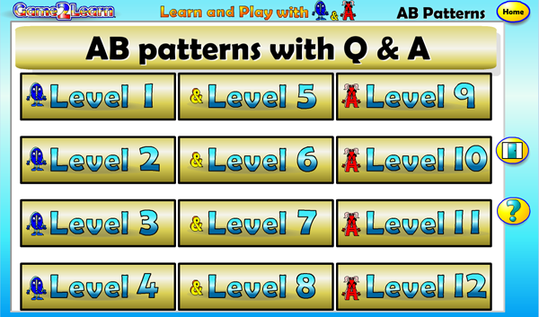 AB patterns with Q&A is has 12 levels of increasing difficulty. Each level includes: