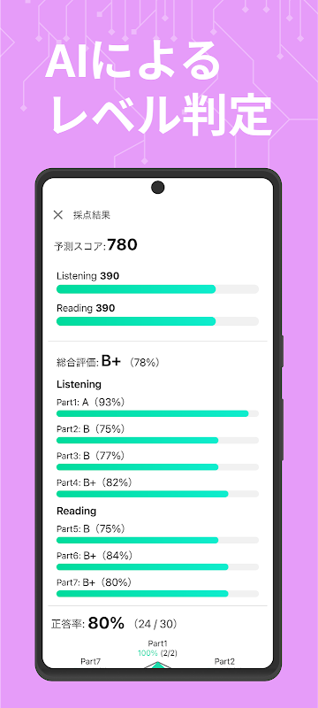 3백만 명이 넘는 abceed 사용자의 학습 데이터를 바탕으로 문제를 해결하기만 하면 TOEIC 점수/어휘 수준을 실시간으로 계산할 수 있습니다.