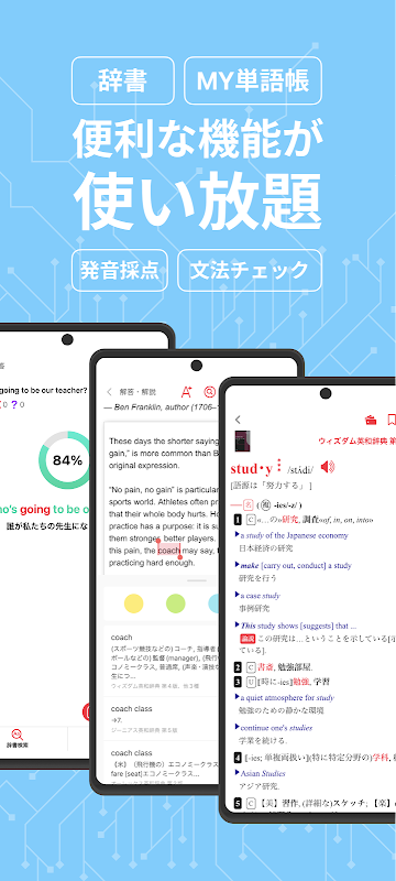 단어나 TOEIC, 영검 문제 등의 퀴즈 기능이나, 섀도잉, 받아쓰기, 슬래시 리딩 등의 풍부한 학습 기능에 대응.
