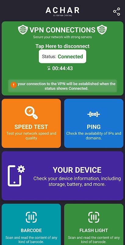 Achar는 전문가와 일반 사용자 모두를 위해 설계된 강력한 안드로이드 툴킷입니다. 매끄럽고 사용자 친화적인 인터페이스를 통해 네트워크 진단, 보안 VPN 연결, 인터넷 속도 테스트, 바코드 스캐닝 등 필수 도구를 하나의 앱에 모두 담았습니다.