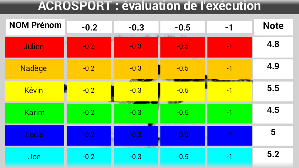 이것은 교사가 아닌 학생을위한 응용 프로그램입니다. 그것은 시간을 절약하고 실행 Acrosport의 평가를 단순화 할 수 있도록해야한다. 이는 현장에서 직접 사용될 수 있지만 여전히 그것의 사용에 편안하게 잘 스케일을 알아야한다. 본 출원은 또한 향적 학생 수행 각 기동 후의 틈을 설정하고이 시간에 테이블을 작성하여 일련의 촬영 영상을보고 사용될 수있다. 할 수있는 다음 더 계산이 응용 프로그램은 모든 것을 돌봐있다.