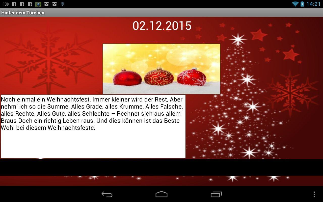 Sie haben noch keinen schönen Adventskalender? Dieser Adventskalender ist sehr ansprechend designed und beinhaltet Weihnachtsmusik, 24 Weihnachtsgrafiken und Weihnachtssprüche, die zu Herzen gehen. Das Highlight: Die Weihnachtssprüche können Sie auf Facebook und Co teilen (bitte Info in der App lesen). Damit Sie in der Adventszeit jeden Tag den passenden Weihnachtsspruch zur Hand haben! Sprache der App: Deutsch.