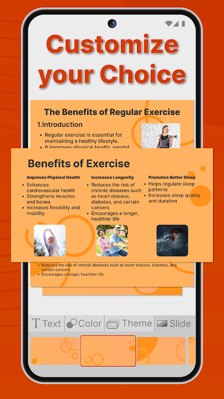 슬라이드 & 프레젠테이션 앱은 다양한 스타일, 템플릿, 내보내기 옵션을 제공합니다. 실시간으로 프레젠테이션을 진행하거나, 디지털 사본을 공유하거나, PPT로 저장하고 싶으신가요? 걱정하지 마세요! 모바일: 슬라이드 메이커의 PPT 편집기는 무한한 유연성을 제공합니다. AI는 원하는 대로 슬라이드를 사용자 지정할 수 있는 옵션을 유지하면서 모든 슬라이드를 지원합니다.