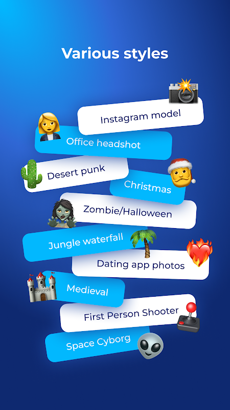 사무실 얼굴 사진, 사막 펑크, 좀비/할로윈 테마, 크리스마스 테마, 정글 폭포, 데이트 앱 사진, 중세, 1인칭 슈팅 게임, 인스타그램 모델, 우주 등 다양한 스타일을 제공하는 최신 AI 사진 생성기 팩을 살펴보세요. 사이보그, 그리고 훨씬 더 🌴🏰👽