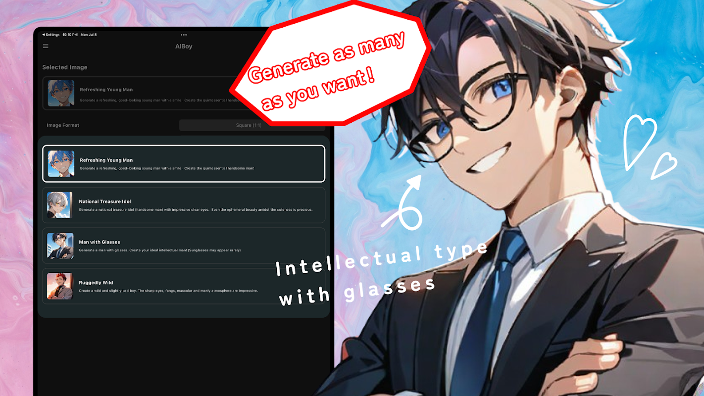AIBoy는 AI 파워를 이용해 나만의 잘생긴 남자 캐릭터나 오리지널 애니메이션 캐릭터를 쉽게 생성할 수 있는 앱입니다. 프롬프트를 입력할 필요가 없습니다. 준비된 다양한 옵션 중에서 선택하기만 하면 독특한 캐릭터를 만들 수 있습니다.