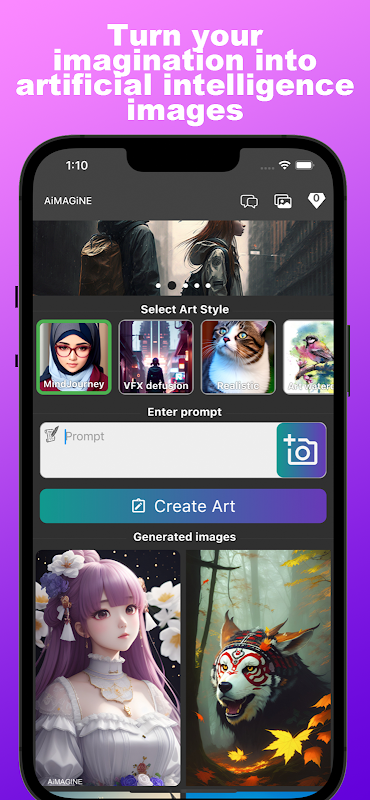 AiMAGiNE의 가장 흥미로운 기능 중 하나는 AI 아트워크를 생성하는 기능입니다. 앱의 AI는 사용자의 텍스트 입력을 기반으로 독특하고 시각적으로 멋진 아트워크를 생성할 수 있어 예술적 표현을 위한 새로운 길을 제공합니다. 사용자는 인상주의, 팝 아트, 추상 미술을 포함한 다양한 예술 스타일 중에서 선택할 수 있으며 앱의 AI는 선택한 스타일과 일치하는 고유한 예술 작품을 생성합니다.