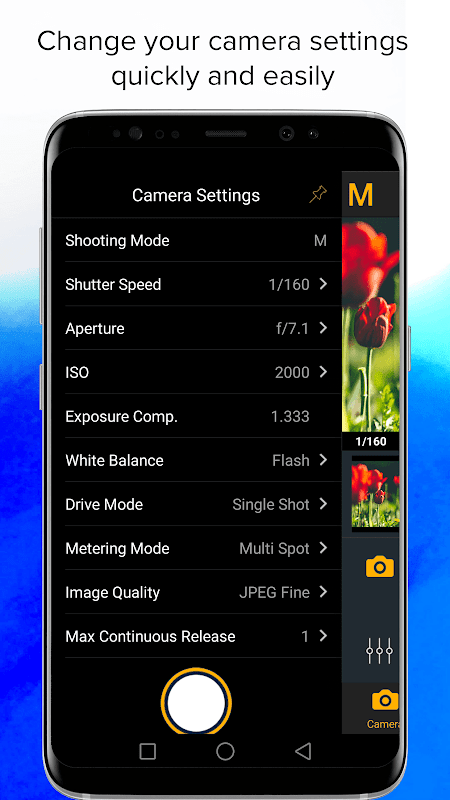 라이브 뷰, 크리에이티브 모드, 자동 초점, 조리개, 셔터, ISO 등을 포함하여 Android 장치에서 많은 카메라 기능 및 설정을 제어합니다. 또한 Air Remote에는 초점 말하기 및 터치 초점과 같이 카메라에서 사용할 수없는 기능이 추가되었습니다.