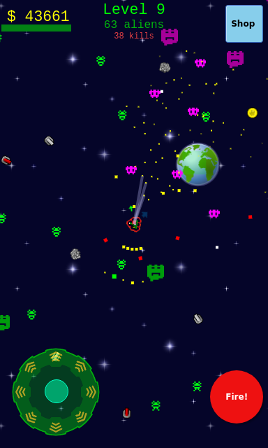 외계인 침공은 안드로이드에 대한 2 차원 공간 사수 게임이다. 당신은 작은 우주선과 촬영 외계인을 제어 할 수 있습니다. 각각의 새로운 수준은 외국인의 새로운 종류를 소개합니다. 일부 외계인 우주선을 개선하는 데 사용할 수있는 금을 놓습니다. 일부 외계인 다시 촬영할 수 있습니다.