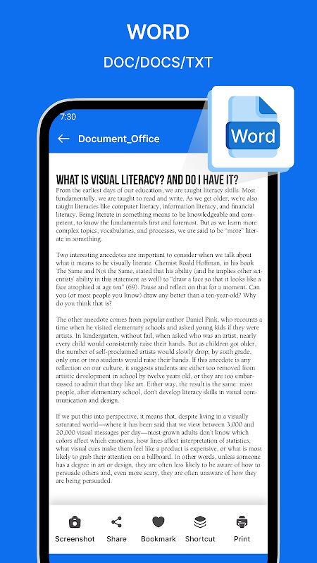 - Docx/Doc/Txt/Docs 뷰어, 간단하고 우아한 리더 화면이 있는 모든 문서 뷰어.