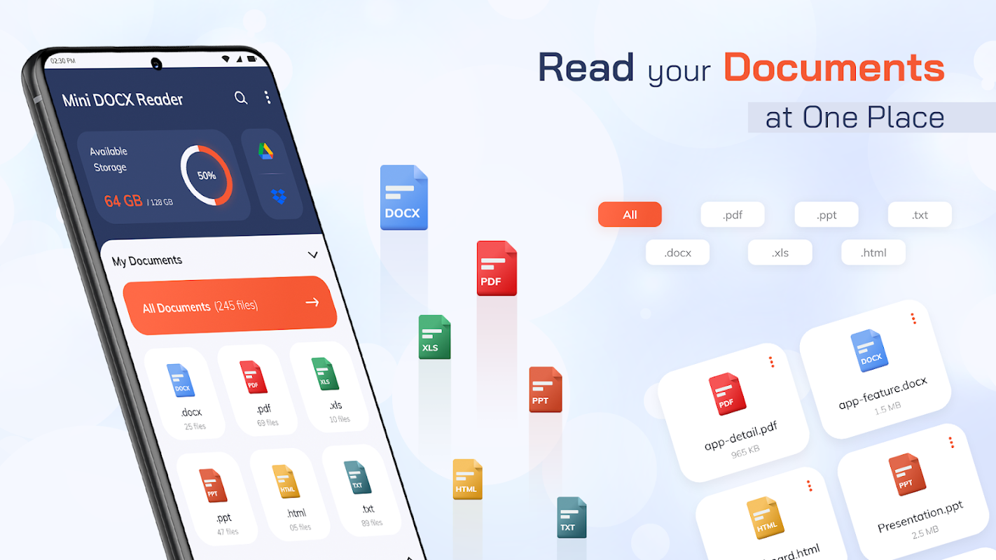 Mini Docx Reader를 사용하면 PDF, Docx, XLS, PPT, TXT 및 HTML과 같은 모든 문서 형식을 읽을 수 있습니다. 앱은 또한 Doc 파일에서 Word 파일을 빠르게 검색하는 데 도움이 됩니다. 학생, 사무실 직원 및 다른 사람들이 Office Reader로 사용할 수 있습니다.