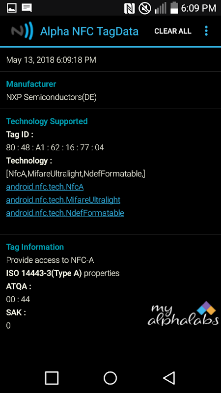 The Alpha NFC TagData™ application reads meta information and data from NFC / High Frequency RFID tags. It is an ideal tool for anyone who is curious about the information stored on their Near Field Communication tags.