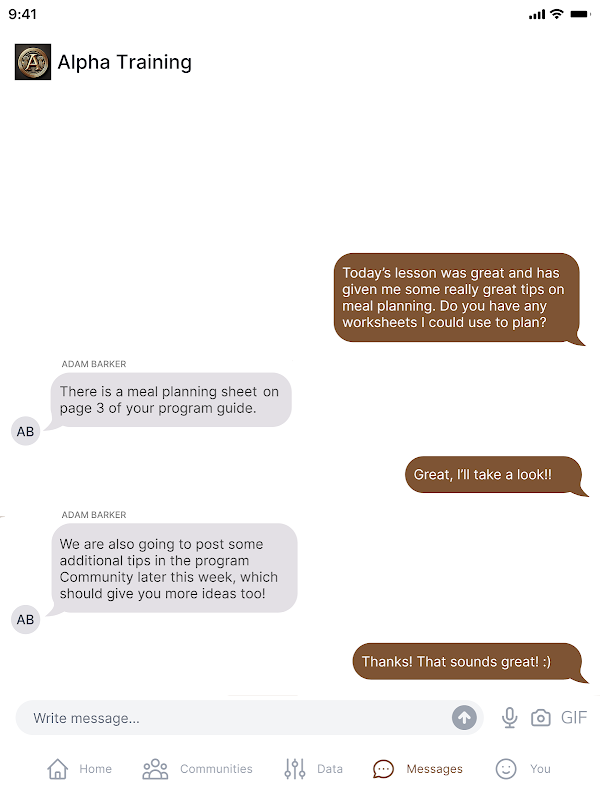 Alpha Training 앱은 Alpha Training 프로그램에 등록한 트레이너 고객을 위해 설계되었습니다. 앱은 푸시 알림을 보내고 트레이너가 보낸 건강한 습관 준수와 관련하여 고객에게 예/아니오 질문에 답하도록 요청합니다. 고객과 트레이너는 진행 상황을 추적하고 고객의 전반적인 건강을 개선하도록 도울 수 있습니다.