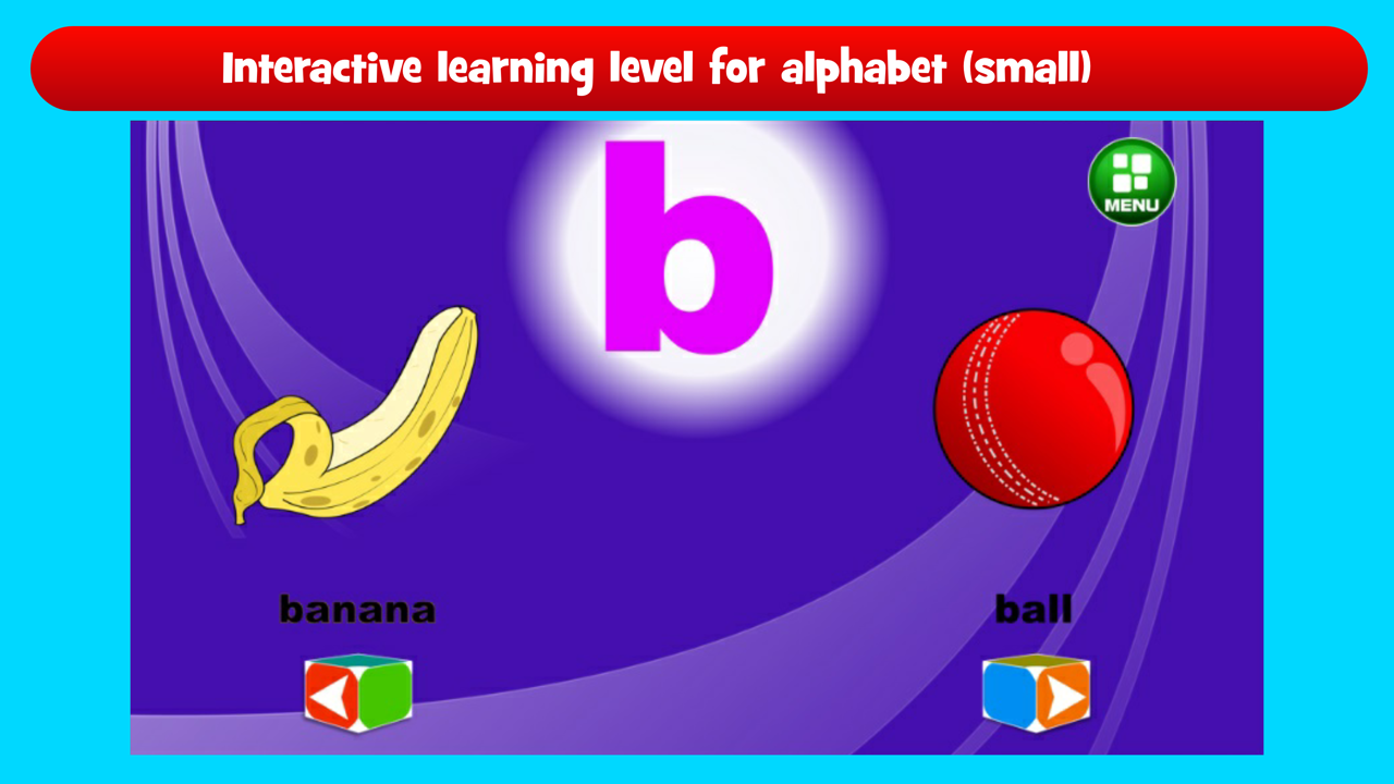 A colorful app for toddlers. It teaches alphabets through pictures.It teaches children alphabets through names of different objects. It plays sounds of animals, vehicles etc. to make it interesting (e.g. D for dog - A dog's picture comes with the barking sound). The app also pronounces the names of objects too.