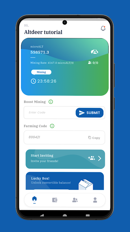 럭키 박스 보상: 6시간마다 ALTDeer 사용자는 앱 내에서 "럭키 박스"를 열어 최대 50,000 μALT를 얻을 기회를 얻을 수 있으며, 이를 통해 채굴 경험에 더 많은 흥분을 더할 수 있습니다.