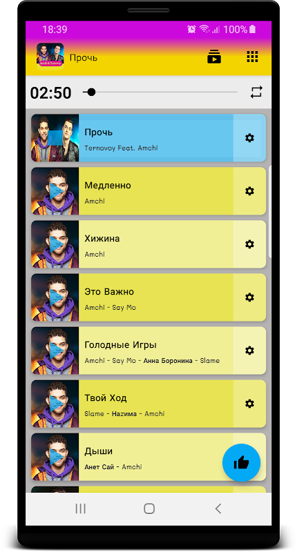 приложение "Amchi & Ternovoy песни - Прочь Не Онлайн" содержит лучшие песни Амчи и Терновой :