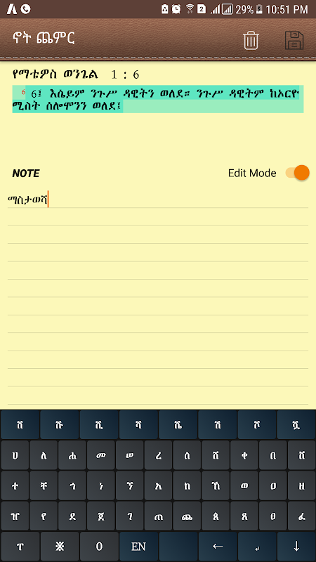 Am 암하라 어 키보드가 통합 된 성경 구절에 노트를 첨부하십시오