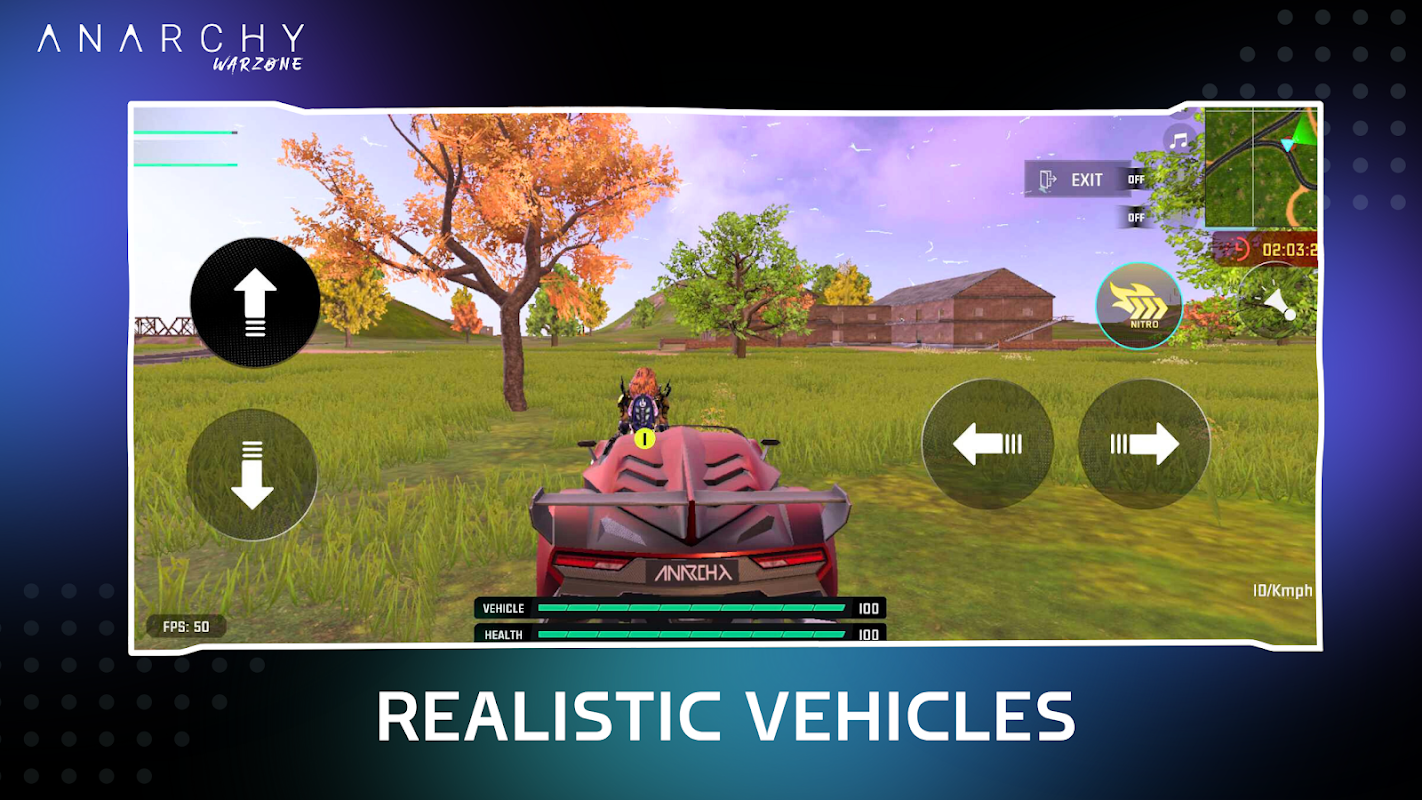 Anarchy Warzone은 사용자 정의 가능한 시각적 품질 설정(높음, 중간, 낮음) 및 사용자 정의 가능한 FPS를 갖춘 사실적인 그래픽을 제공하여 다양한 모바일 장치에 적합합니다. 현재 지도는 사실적인 설정에 중점을 두고 있지만, 향후 업데이트에서는 공중에 떠 있는 육지가 있는 심우주 외계 행성, 중세 시대의 고대 사원 등 판타지 요소가 도입될 예정입니다.