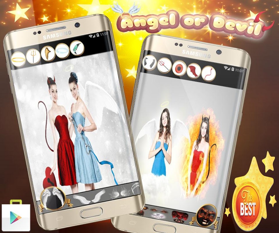 Get this amazing app "Angel & Devil Photo Montage" and accessorize your pictures with cool virtual devil makeover and angel dress up templates! Surprise everyone with the best Angel or Devil app in the store.