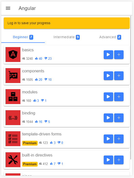 ⭐ 퀴즈는 초급, 중급, 고급 레벨로 분류되어 있어 자신의 속도에 맞춰 Angular 기술을 개발할 수 있습니다.