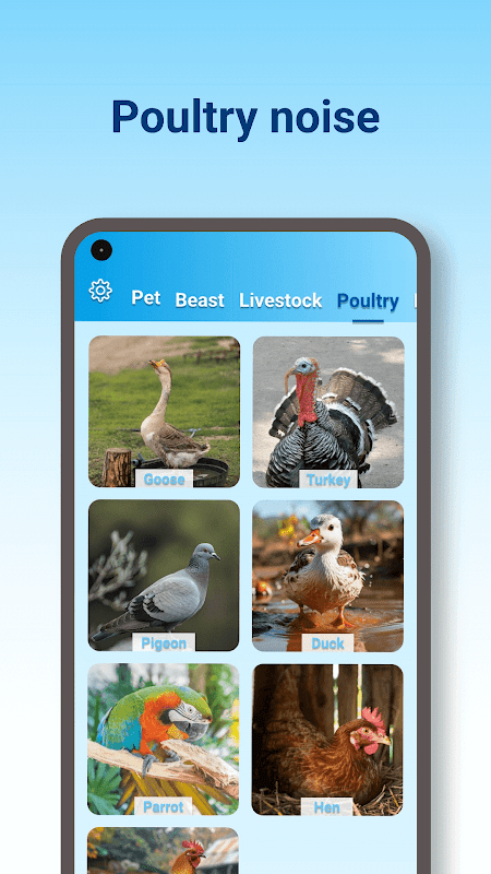 Animal Noise는 짐승, 애완동물, 가축, 가금류, 새의 다섯 가지 유형으로 분류된 동물 소리를 제공하는 애플리케이션입니다. 홈페이지에는 각 동물의 이미지가 표시되어 사용자가 카테고리를 선택하고 듣고 싶은 동물 소리를 선택할 수 있습니다. 선택하면 사용자는 재생 일시 중지를 지원하는 사운드 재생 페이지로 들어가서 들을 수 있습니다.