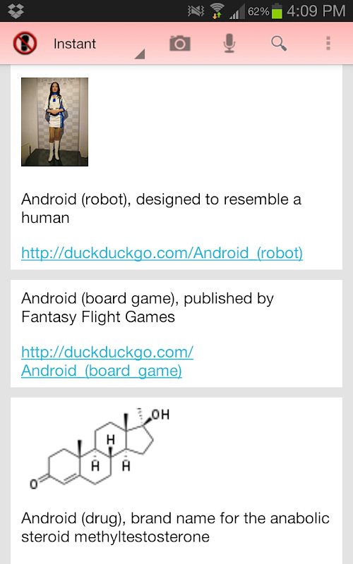 Data from crowd-sourced sites, including Wikipedia, populate the "Instant" results consisting of topic summaries and related topics.