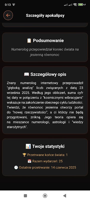 - Detailed descriptions - learn more about each prediction (Mayans, Nostradamus, modern theories)