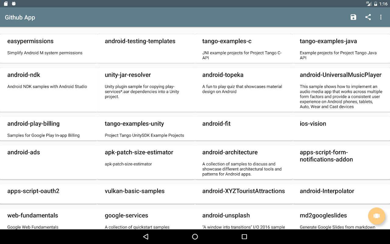 You can use data from Facebook, Github or any other data source in the JSON format or create your own content. Templates for Facebook and Github pages are already included. The created apps will use the Material Design specification for a consistent Android look and feel.