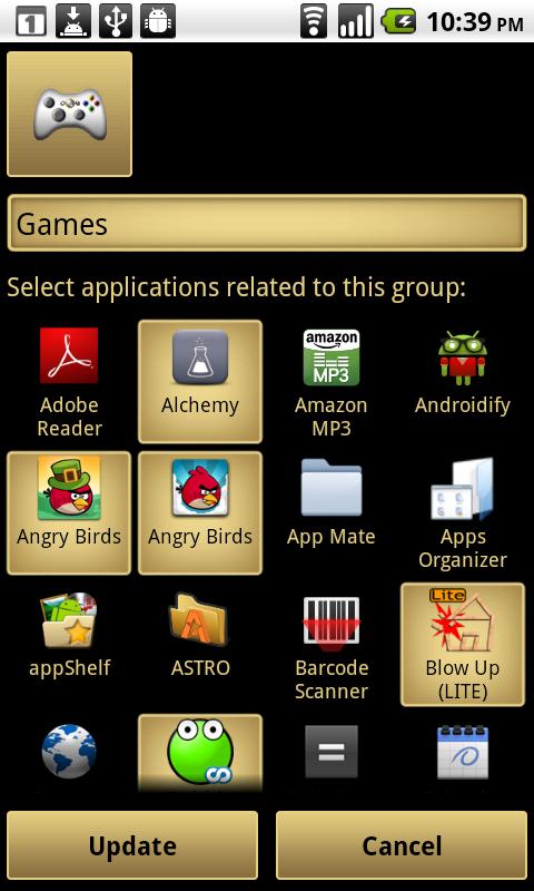 App Shelf allows you to organize your applications quickly and easily. The applications organization is automatically performed depending on the categories in Google Android Market. The application allows you to change the organization according to your wishes. In order to have quick access to the groups you should add desktop shortcut from the appropriate menu (desktop context menu -> Shortcuts).