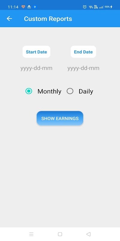 3. 사용자 정의 보고서 : 응용 프로그램은 사용자 정의 보고서를 생성 할 수 있습니다. 일일 또는 월별 수익 보고서를 생성하려면 시작 날짜 및 종료 날짜를 선택해야합니다.