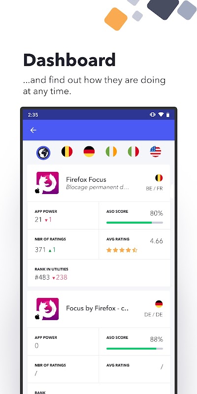 • Monitor your followed apps: App Power, ASO Score, Category ranking, and Ratings