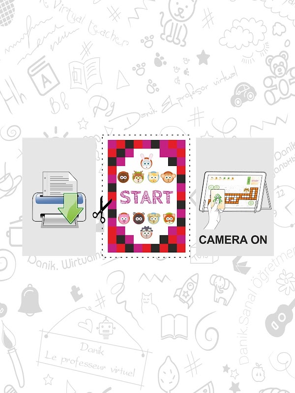Download and print the cards. Solve the tasks of the program and then bring the cards close to the tablet camera. The program makes it possible to use only touchscreen without cards.