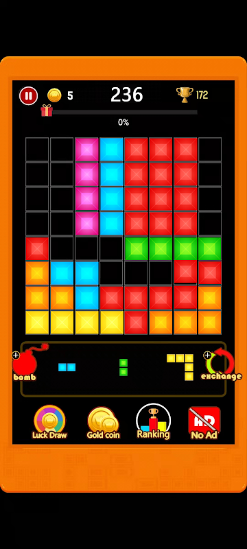 블록 퍼즐은 간단하고 재미있는 캐주얼 제거 게임으로 여가 시간에 매우 적합합니다. 학습 곡선 없이 바로 플레이를 시작할 수 있습니다. 한 줄에 도달하는 한 제거할 수 있으며 이는 매우 시간이 많이 걸립니다. 시간을 잘 살펴보고 너무 과장하지 마세요!