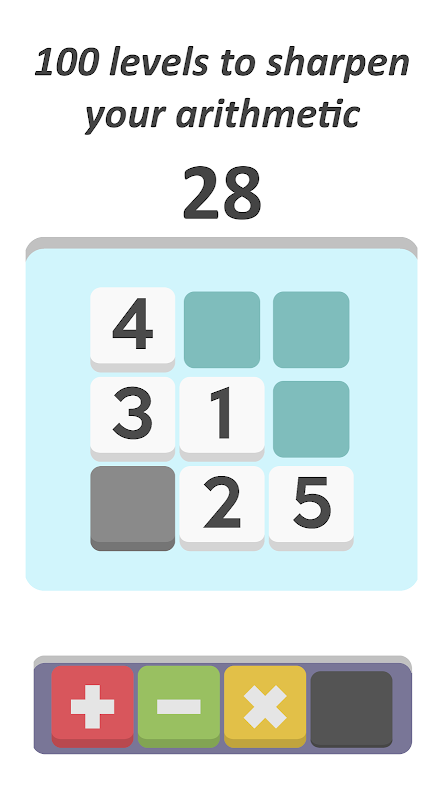레벨: 4개의 기본 산술 연산자와 다양한 특수 연산자를 사용하여 점점 어려워지는 100개의 수제 레벨.
