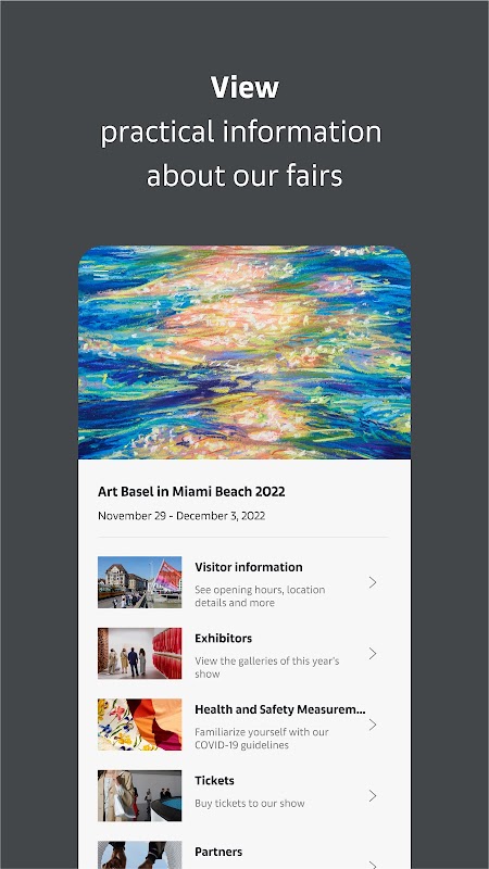 • 전시회에 참석하거나 멀리서 탐색할 때 Art Basel 글로벌 가이드를 사용하세요.
