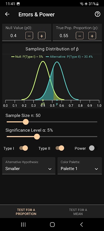 제1종 오류와 제2종 오류를 확인하고 이들이 표본 크기와 실제 모수 값에 어떻게 의존하는지 살펴보십시오. 가설 검정의 힘을 찾고 시각화합니다.