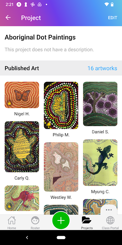 학생: 학생들은 Artsonia에 참여하는 교사의 감독하에 교실에서 직접 자신의 작품을 촬영하고 업로드할 수 있습니다.