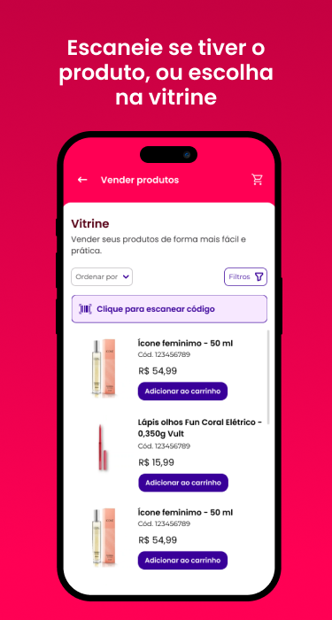 판매하기: 애플리케이션에 접속하면 가방에 있는 제품의 바코드를 쉽게 스캔하여 고객을 위한 맞춤형 카트를 만들 수 있습니다. 휴대폰 화면을 몇 번만 탭하면 그녀의 선호도에 따라 주문을 생성하고 원하는 대로 하나 이상의 항목을 추가할 수 있습니다.