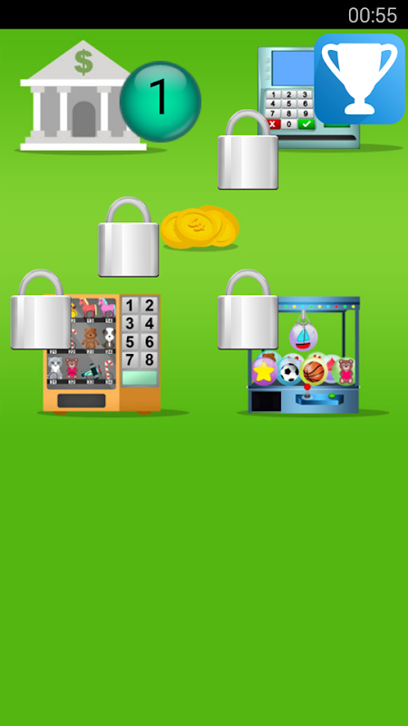 ATM and prize claw game. ATM, vending machine and claw machine in one game!