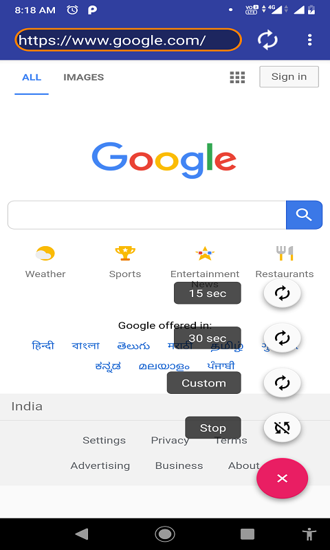 우리 앱에서 웹 페이지를 탐색하고 원하는 시간 차이(15초, 30초 또는 사용자 지정 시간)에 해당 페이지를 자동으로 새로 고칠 수 있습니다. 크리켓 웹사이트를 사용하는 경우 웹 페이지를 새로고침하고 웹사이트가 업데이트하기 전에 점수를 새로 고칩니다. 또는 링크를 사용하여 웹 사이트를 새로 고치기 전에 일부를 표시하는 경우 웹 페이지를 새로 고칩니다.