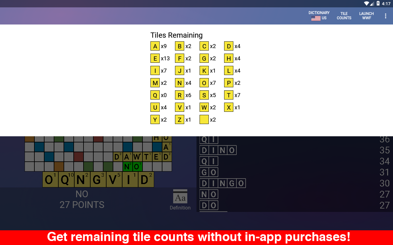 Note: This app is in no way associated with Zynga, Inc, makers of WWF. Additionally, it is only compatible with Words With Friends for now and will not work with other similar games.