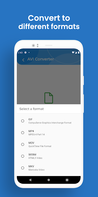 이 변환 응용 프로그램을 사용하면 모든 AVI 비디오 파일을 GIF, MP4, MOV, WEBM, MKV, WMV, FLV, OGV, VOB 및 MPEG와 같은 다른 파일로 변환 할 수 있으며 다른 파일을 AVI로 변환 할 수도 있습니다.
