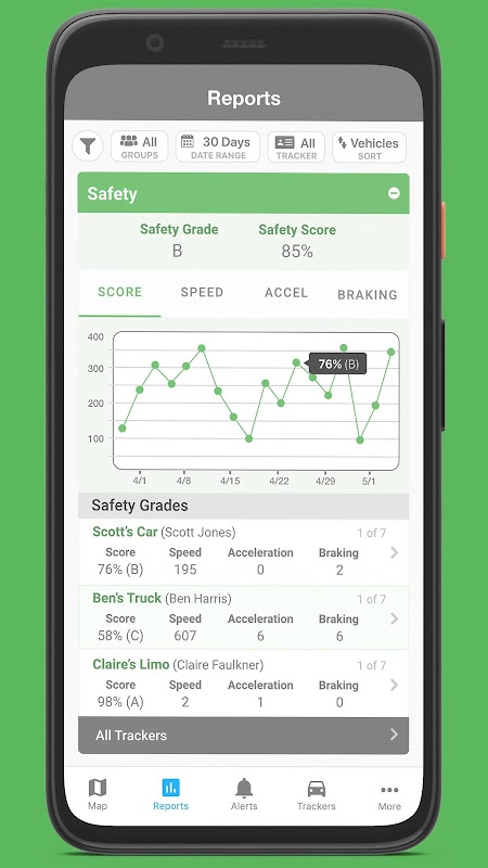 Get essential information about vehicles quickly: address, fuel and battery levels, plus fast access to alerts and reports and supported landscape viewing mode.