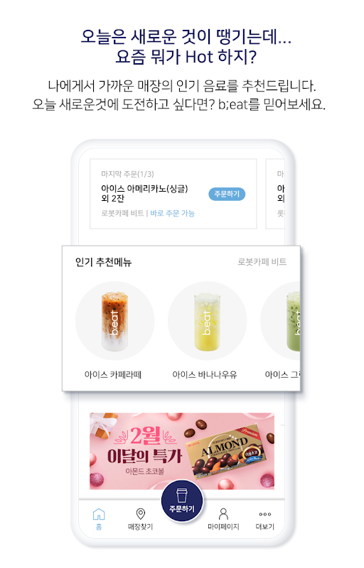 고품질 음료를 쉽게 주문해 빨리 찾자, AI로봇커피 비트의 간편결제 주문 앱으로 오늘부터 커피 천재. 설치 시 쿠폰 100%