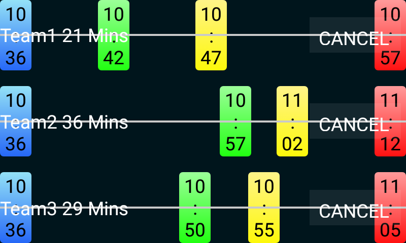 5. Tap the CALCULATE button - This timer is now running. The Air Mins field will change colour and sound an alarm when reaching each of the 15,10 and 1 minute markers. Each active timer can be displayed by changing the Team selection.