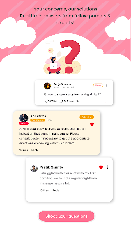 BabyCloud에 가입한다는 것은 20,000명 이상의 부모로 구성된 활발한 커뮤니티의 일원이 된다는 것을 의미합니다. 여기 전용 Q&A 섹션에서 동료 부모는 물론 네트워크에 속한 소아과 의사 및 아동 발달 전문가로부터 질문을 하고 답변을 들을 수 있습니다.