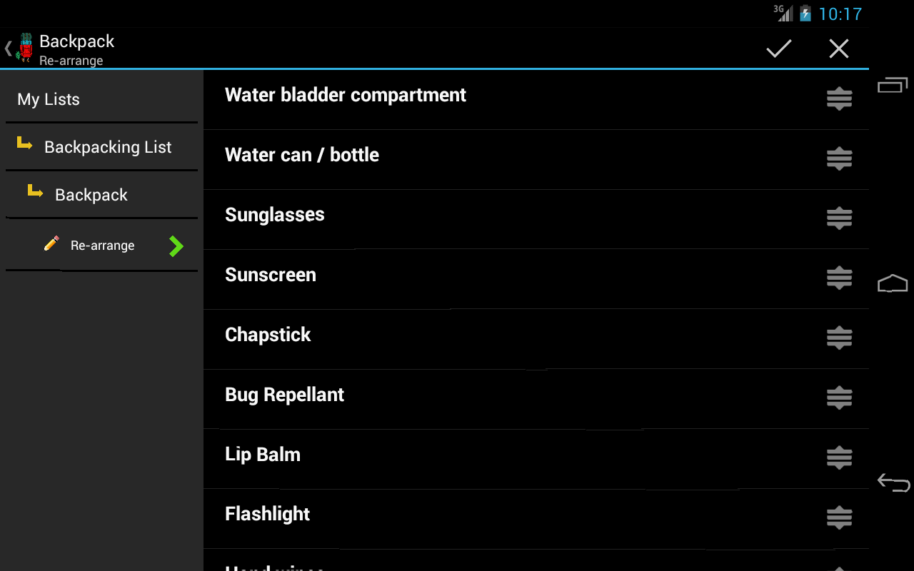 Configurable backpacking planner / checklist with everything needed for any outdoor backpacking trip. Comes pre-populated with more than 250 backpacker items. This is all you need to ensure you don't forget anything. Check/uncheck and reuse everytime you go on your trips. Save all the time typing the list. Easy and very intuitive thumb friendly check/uncheck options.