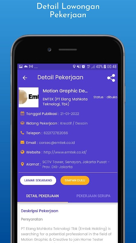 Mohon maaf, untuk memastikan setiap lowongan kerja terhindar dari spam/penipuan, setiap lowongan baru yang masuk akan kami review <24 jam sebelum lowongan muncul di aplikasi