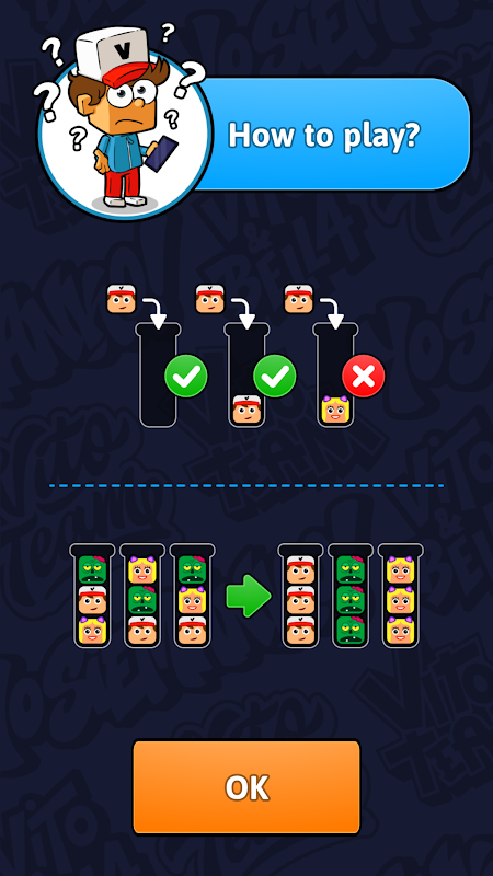 Try to sort the colored balls in vials in such way, so that every vial only contains balls of the same type.