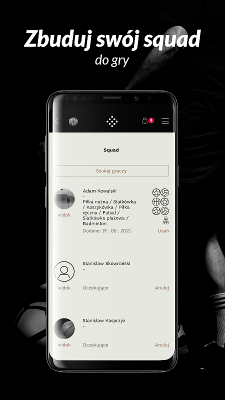 Zapraszasz swoich znajomych lub wybierasz nowych graczy spośród użytkowników aplikacji BallSquad. Stworzony przez Ciebie squad dowie się jako pierwszy o wszystkich meczach, które chcesz zorganizować.