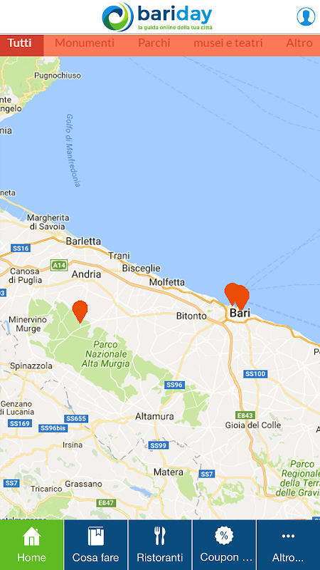 Bariday è la guida online per la città di Bari e provincia. Con la nostra app potrai consultare tutti i luoghi più importanti della città per: fare shopping, dormire, mangiare, trascorrere le tue serate, visitare musei e spettacoli, e tutti gli eventi più importanti!